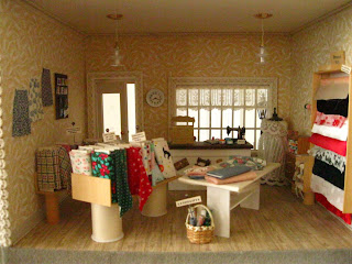 Here's the store downstairs and the apartment upstairs. Fabric wallpaper, fabric floors, various braids for baseboard and door and window moldings, oh, and the store light fixtures are sewing machine bobbins.